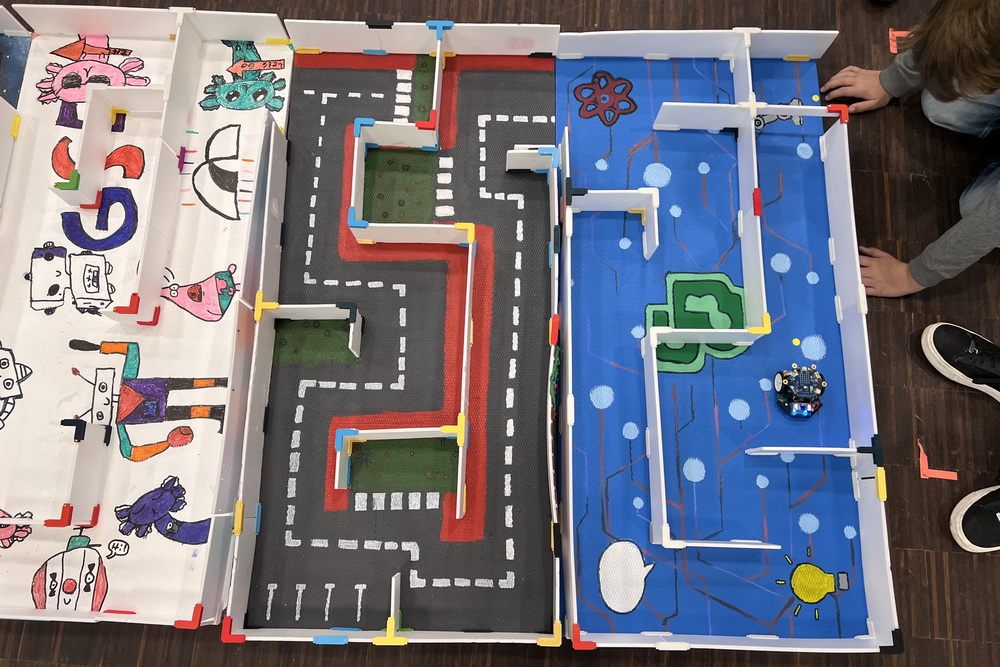 Auch Hannahs (Jgst. 8) und Franziskas (Jgst. 7) Roboter Pico-Go fand den Weg durch diese Labyrinthe. Sie hatten ihn mit der textbasierten Programmiersprache Python so gut programmiert, dass das GBG hier eine gute Punktzahl für Schnelligkeit und wenige Wandberührungen erreichte.
