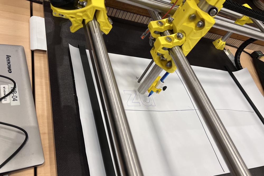 Lukas (Jgst. 7), Jonathan (Jgst. 8) und Kanishk (Jgst.8) absolvierten beide Wettbewerbsaufgaben zu einem Portalroboter. Die begleitende Lehrerin, Frau Müller, war an diesem Tag Teil der Jury und berichtet: „Unser Team hat den Roboter sehr genau kalibriert und damit erreicht, dass dieser eine besonders ordentliche Zeichnung durchgeführt hat. Leider hat dies Abstriche bei der Geschwindigkeit bedeutet.“