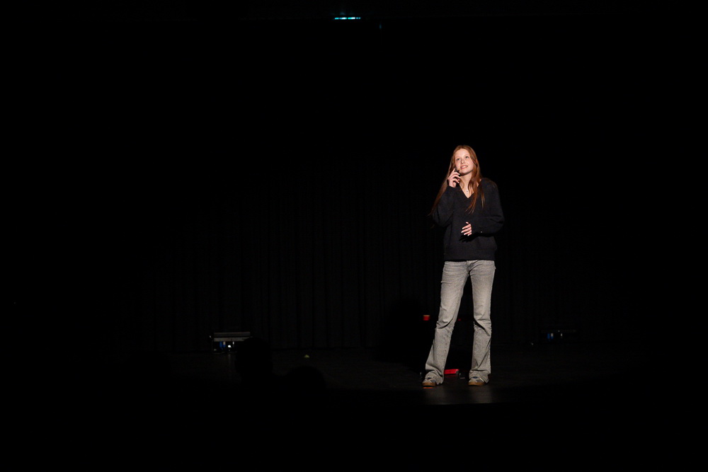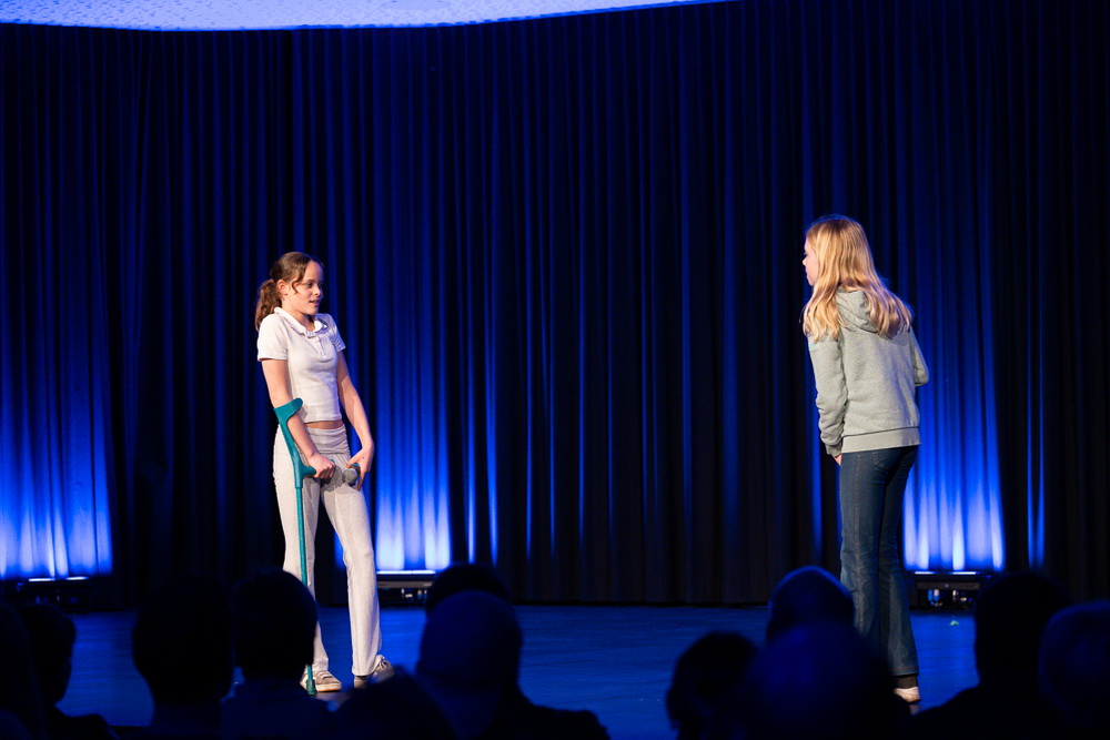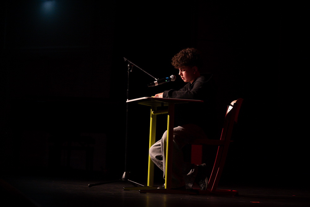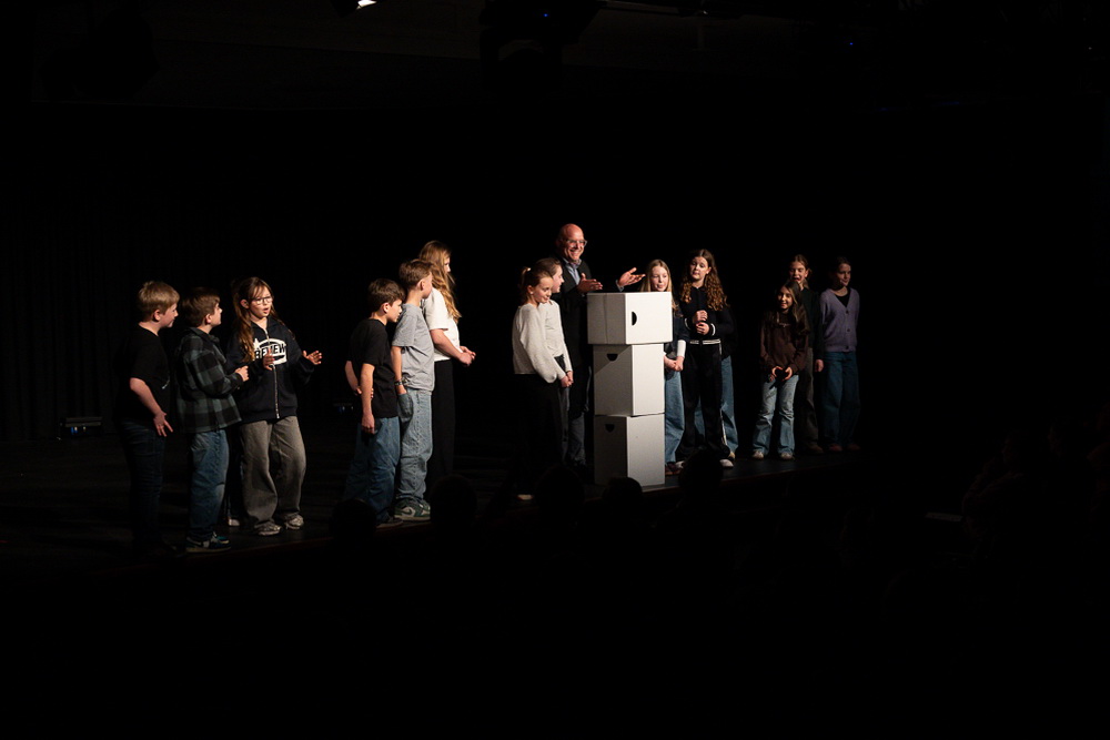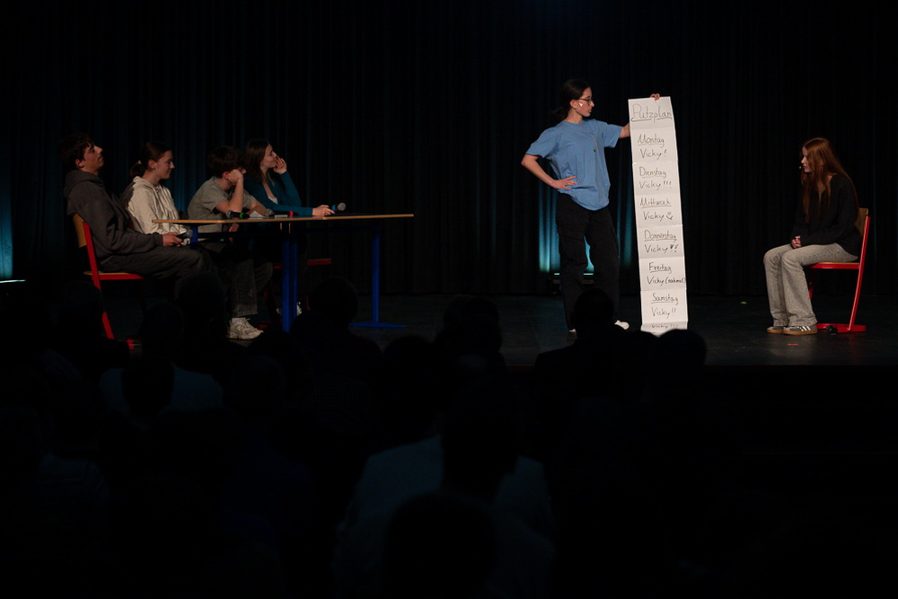 Schon der Auftakt setzte ein visuelles Ausrufezeichen: Die Schwarzlicht-AG unter der Leitung von Herrn Oberländer brachte das Publikum mit „Auf die Plätze, fertig, …“ in eine besondere Atmosphäre. Direkt im Anschluss zeigte Nema (6b) mit ihrem Beitrag zu Donald Trump, wie politisch, pointiert und gleichzeitig unterhaltsam Schülerbeiträge sein können. Auch sprachlich und performativ wurde es früh abwechslungsreich: Yannis Schmidt (6a), Sieger des Vorlesewettbewerbs, überzeugte mit seiner „Vor-Lesung“, während Beiträge wie „Verletzende Worte“ (Namalia, 6b), „Die Dummchen“ (6c) oder „Mamas“ (BIBIS, 6c) unterschiedliche Facetten von Sprache, Humor und Nachdenklichkeit auf die Bühne brachten.