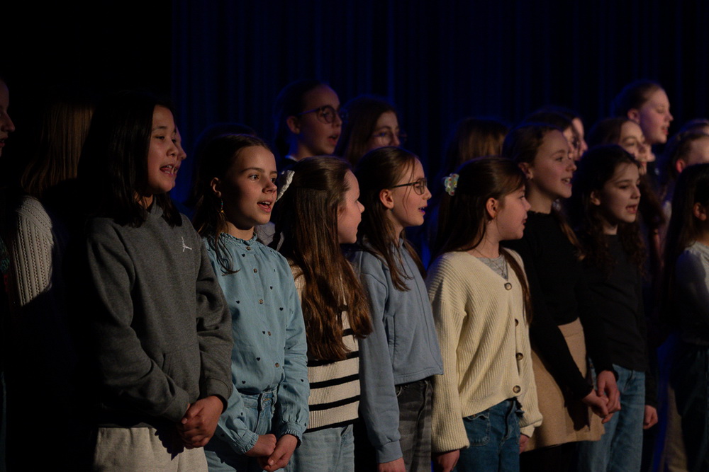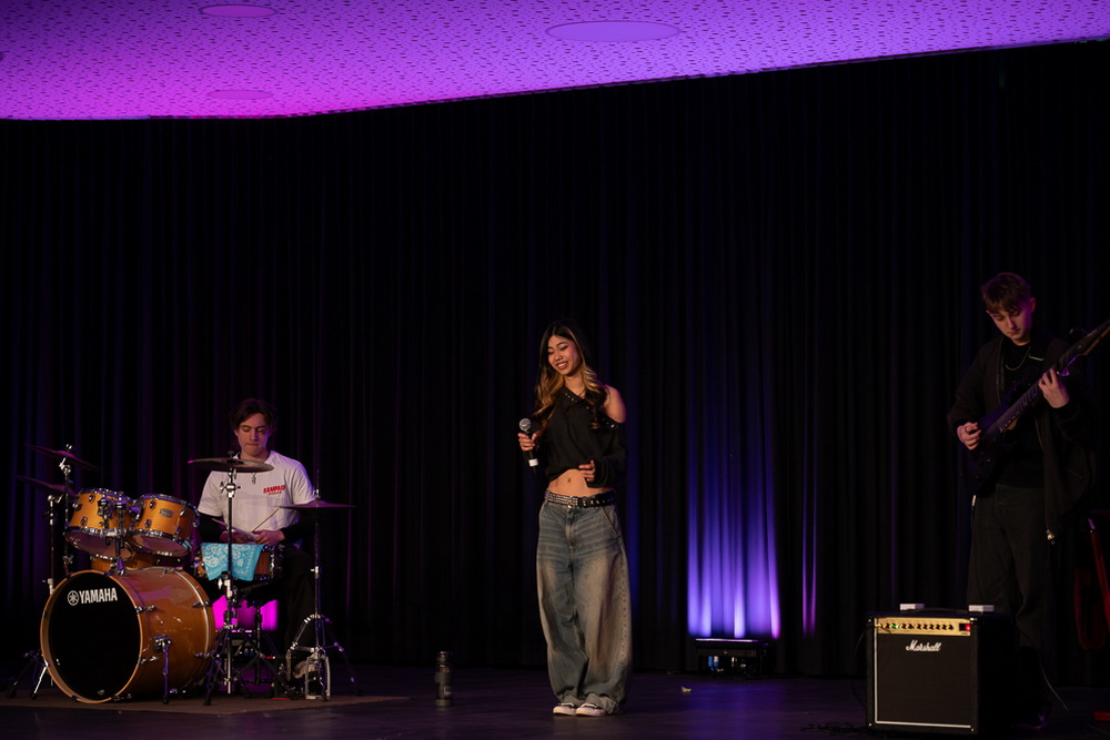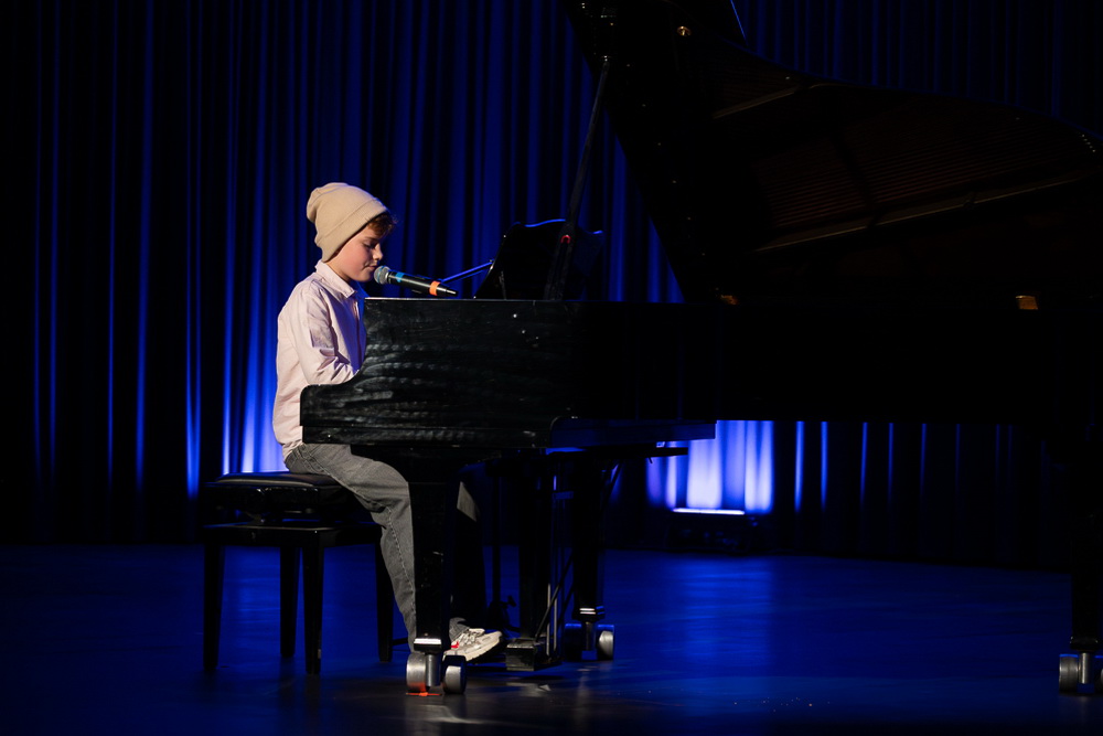 Nach der Pause wurde es rockiger: Die Schulband (Raum 144) unter der Leitung von Frau Friedrich brachte mit „Smells Like Teen Spirit“ (Nirvana) und „The Kill“ (Thirty Seconds to Mars) spürbar Energie in den Saal. Auch kreative Eigenproduktionen hatten ihren Platz: Die Gruppe Crazy 4 präsentierte mit „Ich schreibe einen Text …“ einen originellen Beitrag, während Anton Eicke (6c) mit „King of Pop“ ein eigenes Stück auf die Bühne brachte – komponiert mit Unterstützung von Herrn Neumann.