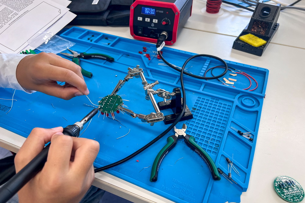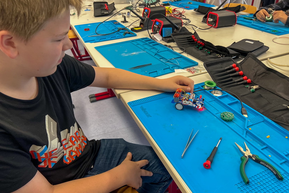 Mitgebracht hatten die Mitarbeiter des externen Schulpartners, der Firma suThom GmbH, nicht nur spannende Roboter wie Calli:bot und PicoGo, sondern auch das Know-how: Lauflichter löten, erste Schritte in den Programmiersprachen NEPO und Python, 3D-Druck mit passender Software – die Vielfalt ließ keine Langeweile aufkommen.