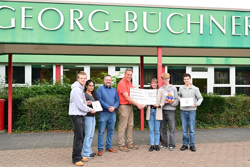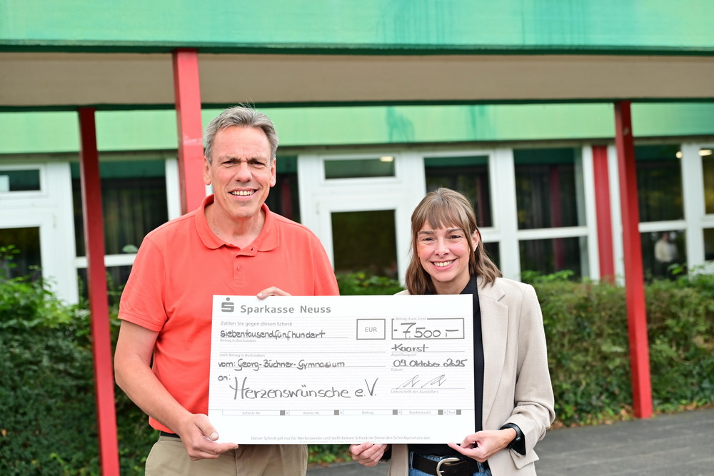 Kaarst. Mit großem Einsatz und schmerzenden Füßen liefen die Schülerinnen und Schüler des Georg-Büchner-Gymnasiums beim diesjährigen Sponsorenlauf insgesamt die neue Rekordsumme von knapp 30.000 Euro zusammen. Dieser Erlös wird sowohl für schulische als auch außerschulische Zwecke genutzt. Ein Viertel des Betrages, 7500 Euro, wurde nun durch den Schulleiter Volker Werker, die Schülervertretung und die Lehrerschaft, vertreten durch Rouven Peters, offiziell an den Verein Herzenswünsche e. V. übergeben, der schwerkranken Kindern besondere Wünsche erfüllt.