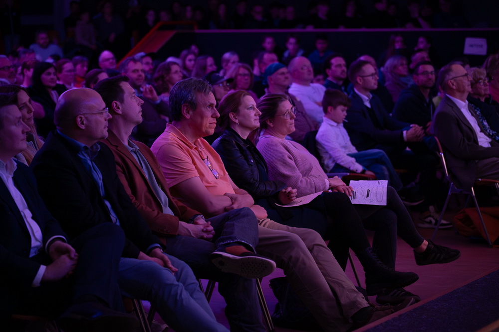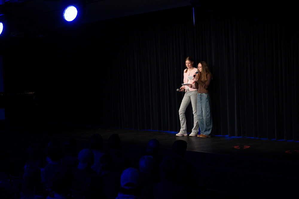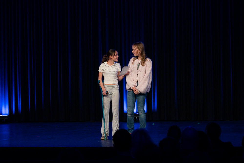 Schon der Auftakt setzte ein visuelles Ausrufezeichen: Die Schwarzlicht-AG unter der Leitung von Herrn Oberländer brachte das Publikum mit „Auf die Plätze, fertig, …“ in eine besondere Atmosphäre. Direkt im Anschluss zeigte Nema (6b) mit ihrem Beitrag zu Donald Trump, wie politisch, pointiert und gleichzeitig unterhaltsam Schülerbeiträge sein können. Auch sprachlich und performativ wurde es früh abwechslungsreich: Yannis Schmidt (6a), Sieger des Vorlesewettbewerbs, überzeugte mit seiner „Vor-Lesung“, während Beiträge wie „Verletzende Worte“ (Namalia, 6b), „Die Dummchen“ (6c) oder „Mamas“ (BIBIS, 6c) unterschiedliche Facetten von Sprache, Humor und Nachdenklichkeit auf die Bühne brachten.