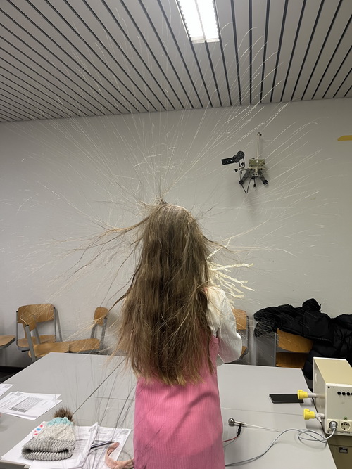 Für Begeisterung sorgte die Physik gleich doppelt: Bei Versuchen mit Strom standen sprichwörtlich die Haare zu Berge – ein eindrucksvoller Moment, der für Staunen und viele neugierige Nachfragen sorgte. Darüber hinaus konnten die Schülerinnen und Schüler auch an Licht- und Optikstationen experimentieren, etwa indem sie mit einer Lichtquelle und optischen Bauteilen Lichtwege untersuchten und Einstellungen ausprobierten.