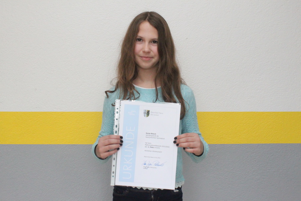 Sonja Blesch aus der Klasse 6b hat in diesem Jahr am Mathematikwettbewerb des Rhein-Kreis Neuss teilgenommen und einen sensationell guten zweiten Platz belegt.